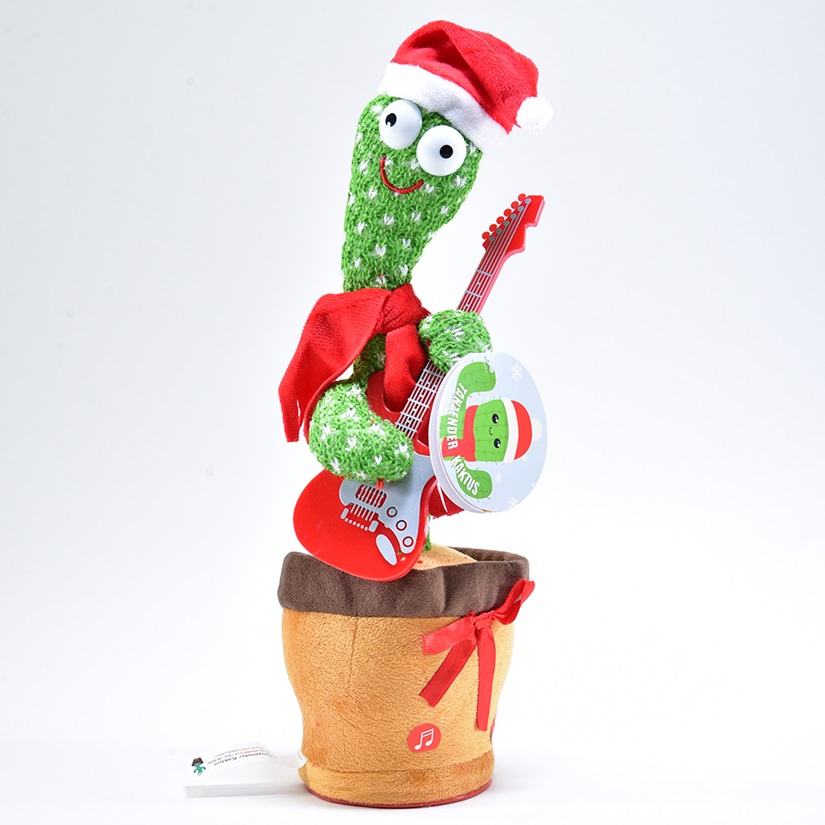 Dieser Kaktus ist ein echter Hingucker! Er trägt eine lustige Weihnachtsmütze, Gitarre und einen Schal. Er tanzt fröhlich in seinem Topf zu verschiedenen Melodien. Aber das ist noch nicht alles: Er kann auch deine Stimme aufnehmen und wiedergeben. So kannst du ihm lustige Sprüche beibringen oder ihn mit deinen Freunden reden lassen. Ein tolles Geschenk für Groß und Klein! Der Kaktus ist aus weichem Polyester gefertigt und hat eine Größe von 11 x 11 x 41 cm.