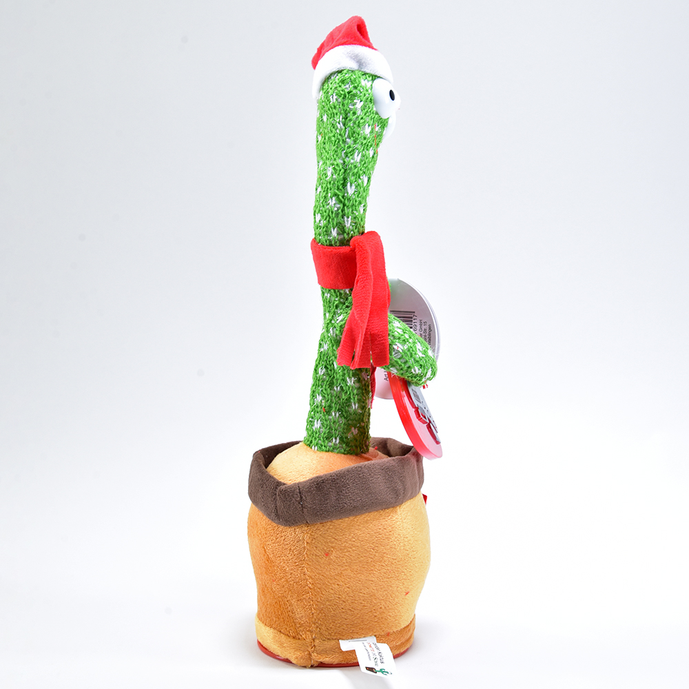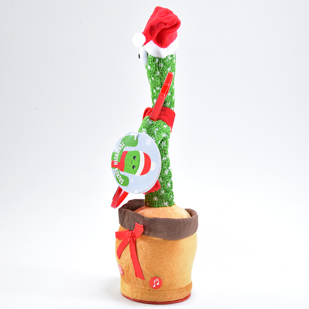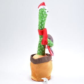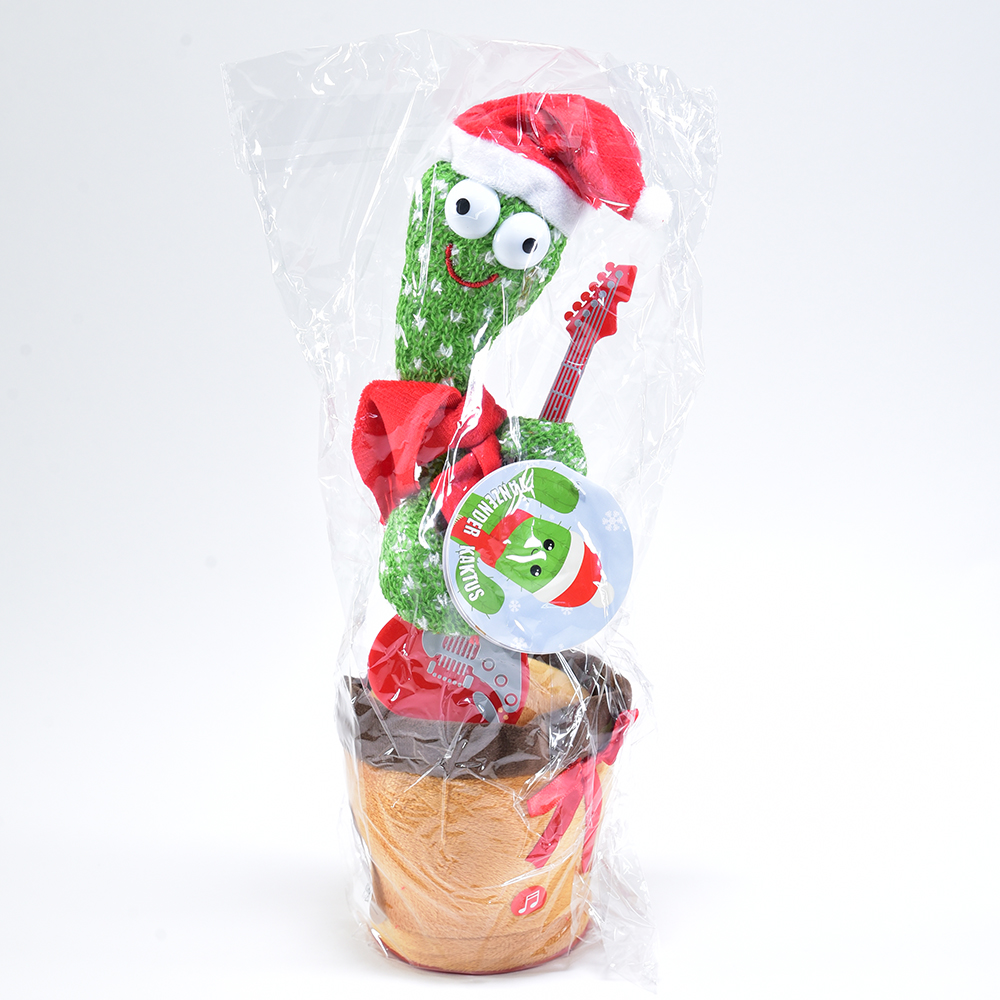 Dieser Kaktus ist ein echter Hingucker! Er trägt eine lustige Weihnachtsmütze, Gitarre und einen Schal. Er tanzt fröhlich in seinem Topf zu verschiedenen Melodien. Aber das ist noch nicht alles: Er kann auch deine Stimme aufnehmen und wiedergeben. So kannst du ihm lustige Sprüche beibringen oder ihn mit deinen Freunden reden lassen. Ein tolles Geschenk für Groß und Klein! Der Kaktus ist aus weichem Polyester gefertigt und hat eine Größe von 11 x 11 x 41 cm.